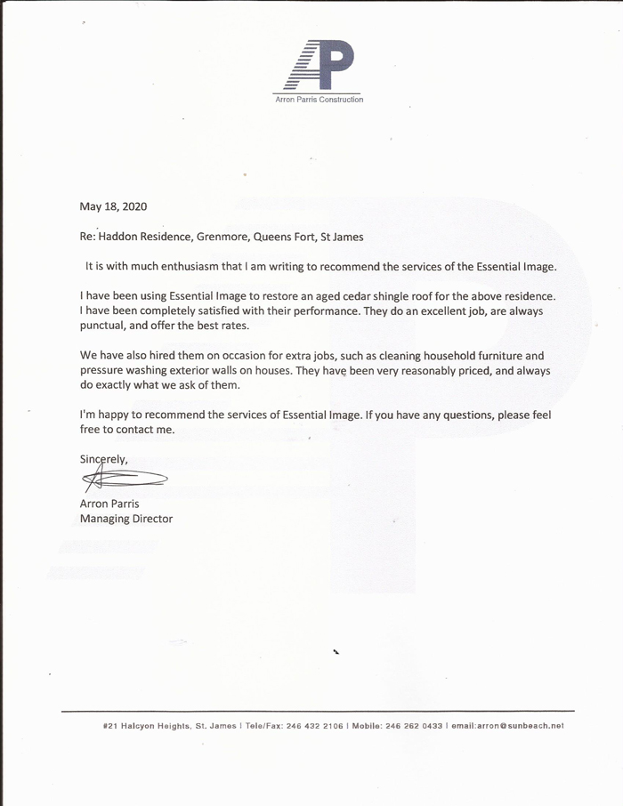 Essential Image for all of your soft washing needs and wants!! That is my blurb for this company. Being a property owner, I have had reason to need to tidy up property on occasion and also to scratch my head on how to handle mold and moss build up. Dwayne Goodridge took that headache out of my hands in short order. Essential Image has proven themselves time and again with the projects they have done for me personally not to mention the referrals to them. The thorough and frank assessment by them of the problem and its treatment, the equipment proposed to be used and the environmentally friendly products to be employed in order to not only satisfy the client, the building but the pets and the plants, was one of the main reasons that Dwayne Goodridge continues to get my vote each time for soft-washing work to be done. Thus far I will also say that the ’ before and after’ results for the work have been exemplary and have been to such a high quality that I ended up saving money by not having to re-decorate walls and exteriors in several instances due to the lovely restorations.